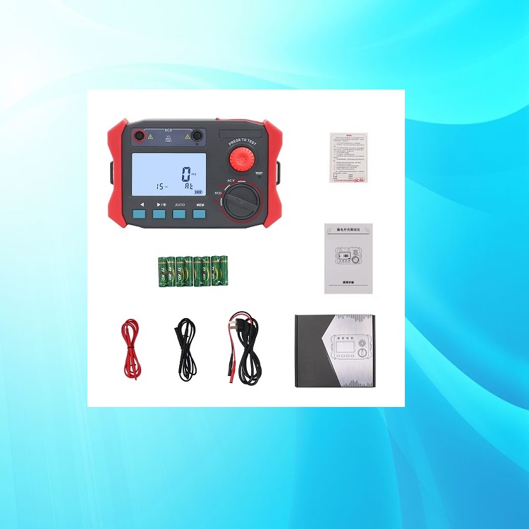 漏电开关测试仪,由主机、测试线、等组成。简小便携,4位大LCD显示,灰白屏显示,一目了然,操作方便易用。大容量存储500组数据,交流电压测量范围:0V~750V,直流电压测量范围:0V~1000V,测量精度:±5%rdg±5dgt。测试漏电电流从15~500mA,一共分十个档位(15 ;30 ;50 ;75 ;100 ;150 ;200 ;250 ;300 ;500mA),测试漏电流动作时间量程为0~999mS。