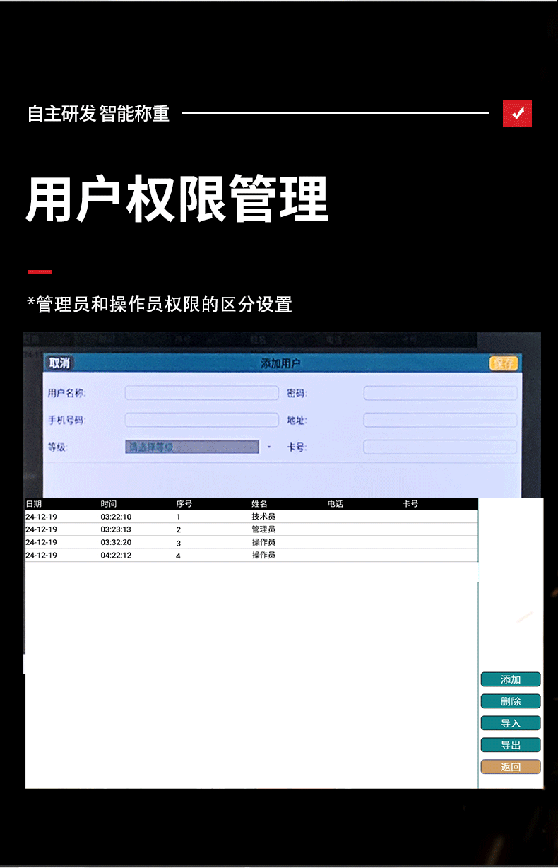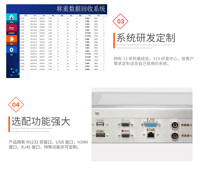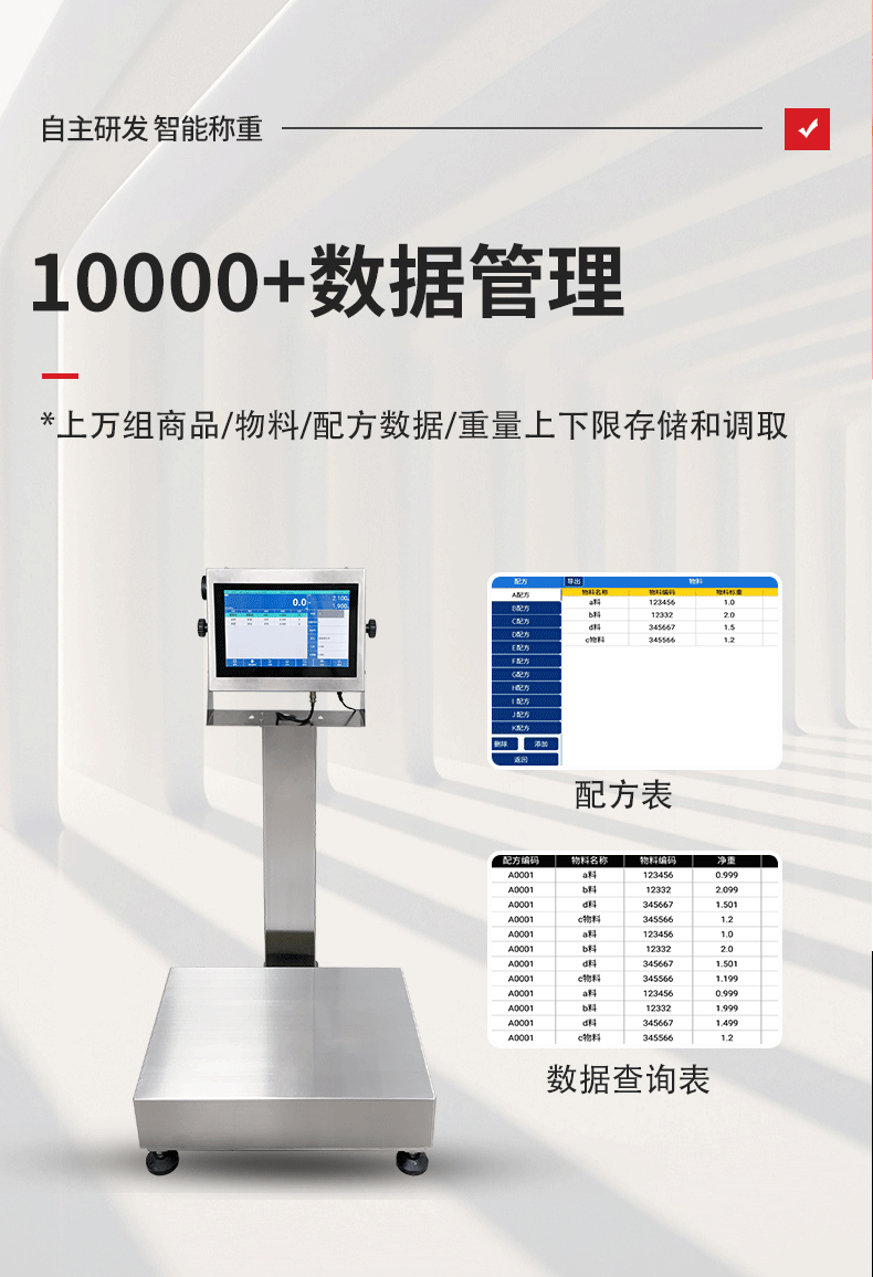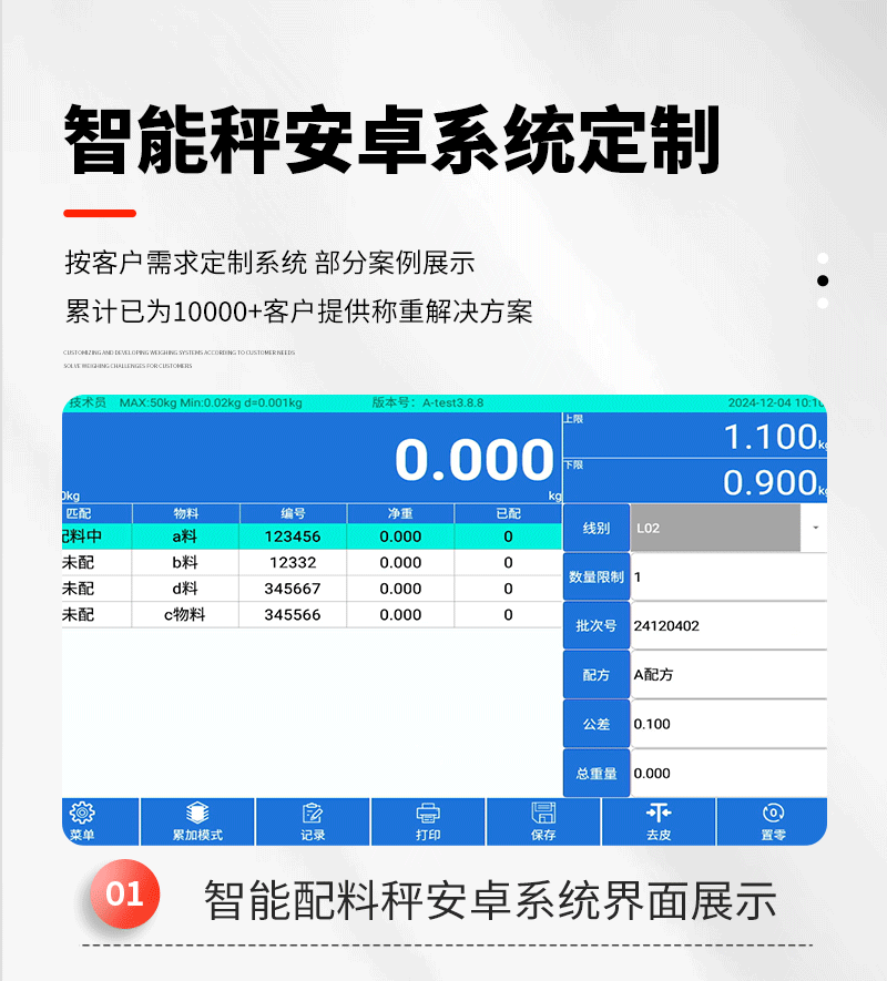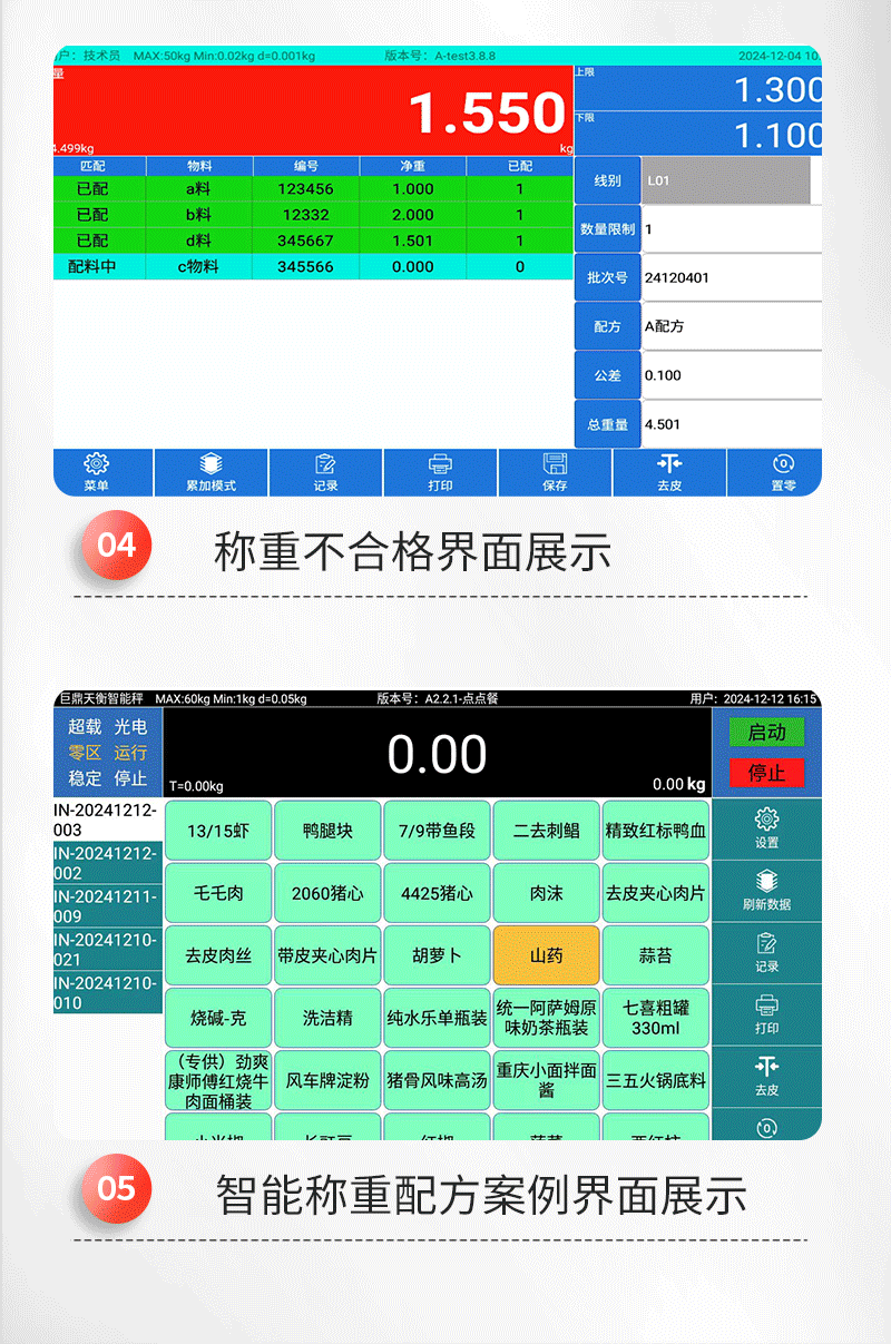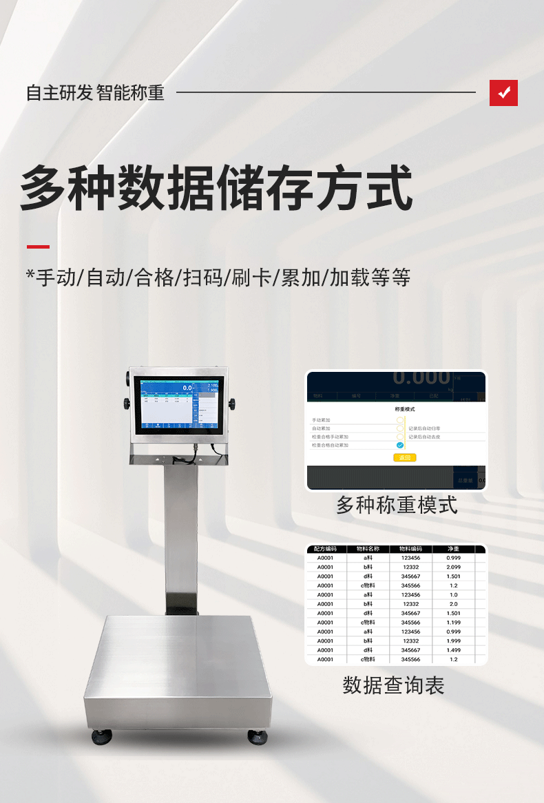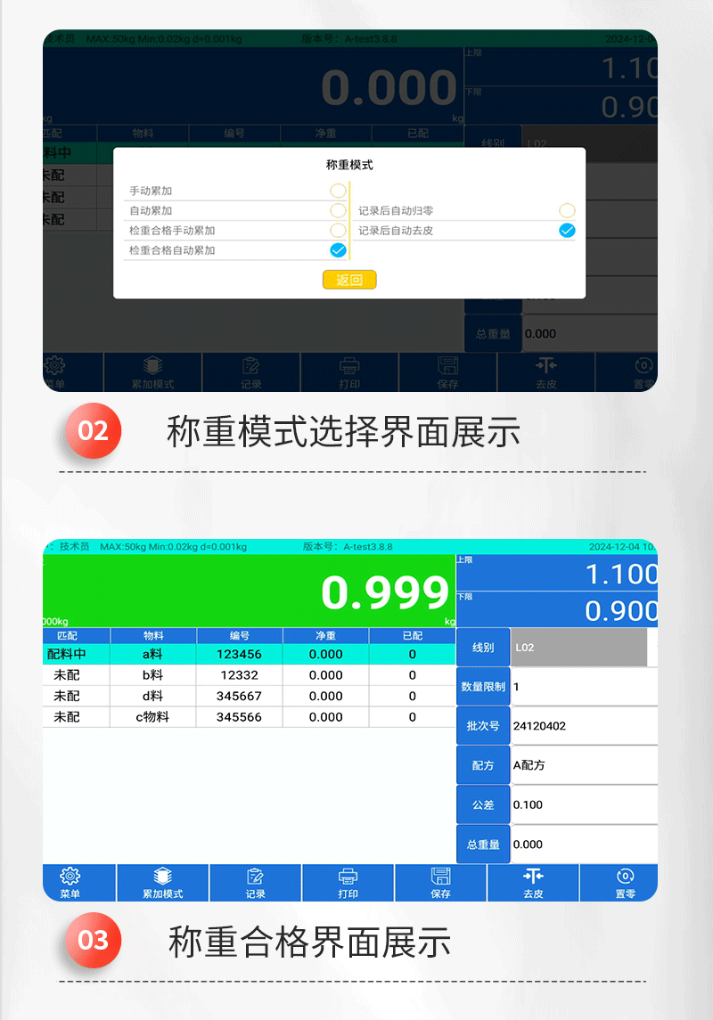 带串口通讯电子秤带串口通讯电子秤带串口通讯电子秤带串口通讯电子秤1. 手动累加——使用手动累加时,选择好需要称重的产品,将需要过磅的物料放到称重平台上,当称重稳定后,点击 键即可保存称重数据;2. 自动累加——选择自动累加时,选择好需要称重的产品,将需要过磅的物料放到称重平台上,当称重稳定后,系统会自动保存称重数据;3. 卸载自动累加——选择卸载自动累加时,选择好需要称重的产品,将需要过磅的物料放到称重平台上,当称重稳定后,拿走物料,系统会自动保存稳定时的称重数据;4. 扫码累加——选择扫码累加时,选择好需要称重的产品,将需要过磅的物料放到称重平台上,当称重稳定后,扫描条码或二维码,系统会将重量数据和条码数据对应保存记录。*检重合格——确认好以上四种数据保存的模式后,勾选“检重合格”系统只记录合格时数据,当检重不合格时,系统不记录。*检重不合格——确认好以上四种数据保存的模式后,勾选“检重不合格”系统只记录不合格时数据,当检重合格时,系统不记录。